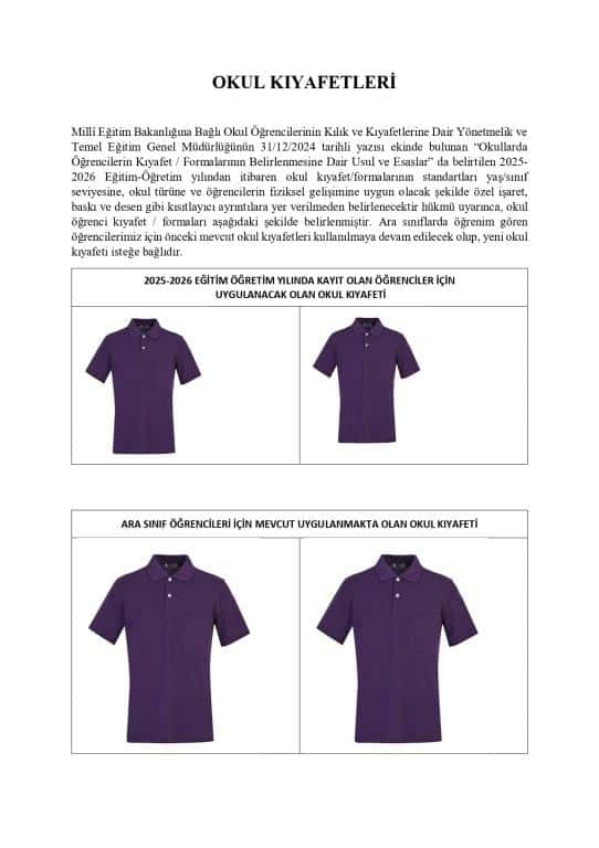 Millî Eğitim Bakanlığına Bağlı Okul Öğrencilerinin Kılık ve Kıyafetlerine Dair Yönetmelik ve Temel Eğitim Genel Müdürlüğünün 31/12/2024 tarihli yazısı ekinde bulunan “Okullarda Öğrencilerin Kıyafet / Formalarının Belirlenmesine Dair Usul ve Esaslar” da belirtilen 2025-2026 Eğitim-Öğretim yılından itibaren okul kıyafet/formalarının standartları yaş/sınıf seviyesine, okul türüne ve öğrencilerin fiziksel gelişimine uygun olacak şekilde özel işaret, baskı ve desen gibi kısıtlayıcı ayrıntılara yer verilmeden belirlenecektir hükmü uyarınca, okul öğrenci kıyafet / formaları aşağıdaki şekilde belirlenmiştir. Ara sınıflarda öğrenim gören öğrencilerimiz için önceki mevcut okul kıyafetleri kullanılmaya devam edilecek olup, yeni okul kıyafeti isteğe bağlıdır.